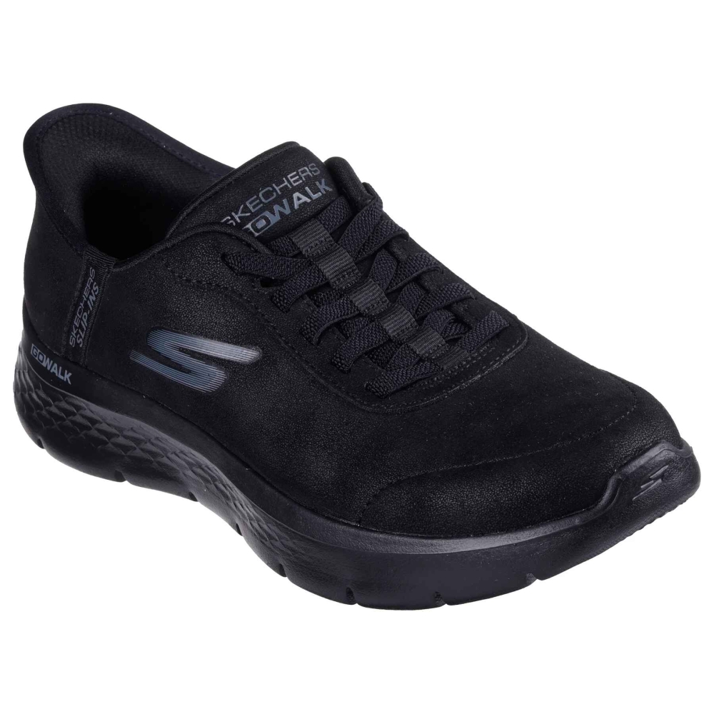 Caminha em conforto e amortecimento prático usando as Skechers Hands Free Slip-ins® GO WALK Flex - Mali. Desenhado com a nossa Heel Pillow, este modelo No Tie Fit tem a parte superior em pele vegana, atacadores elásticos, palmilhas Skechers Air-Cooled Memory Foam e amortecimento ULTRA GO® leve.
